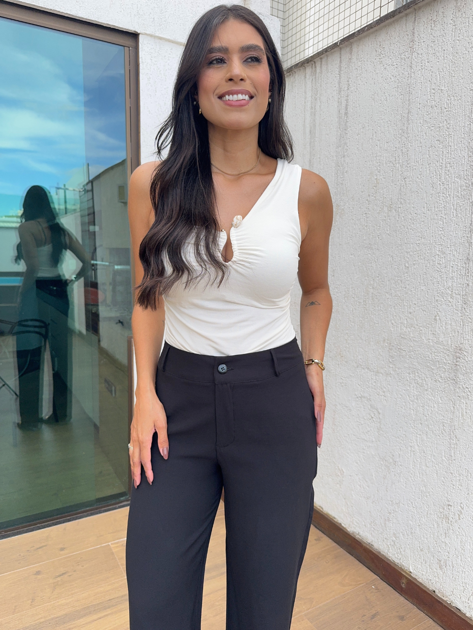 Diferenciais: tecido alfaiataria encorpado, modelagem que valoriza a silhueta, cor neutra e atemporal. Aceitamos devoluções em até 7 dias.