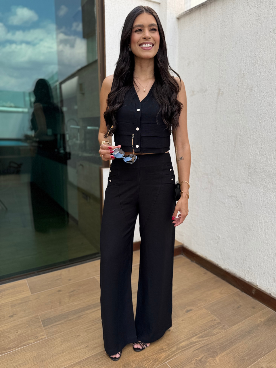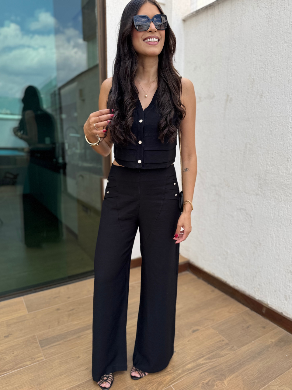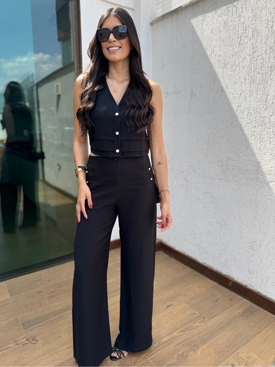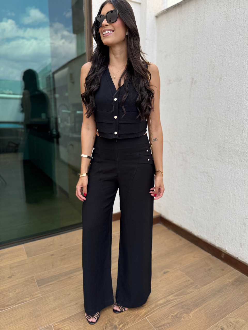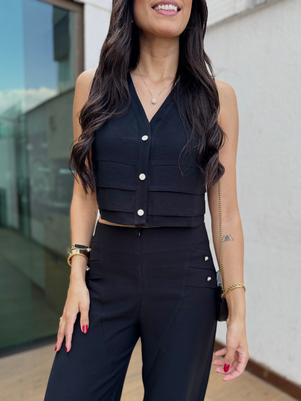 Conjunto em alfaiataria - a calça alfaiataria apresenta ziper frontal para fechamento e botões perolados nas laterais para deixa a peça ainda mais diferenciada. Não possui bolso.