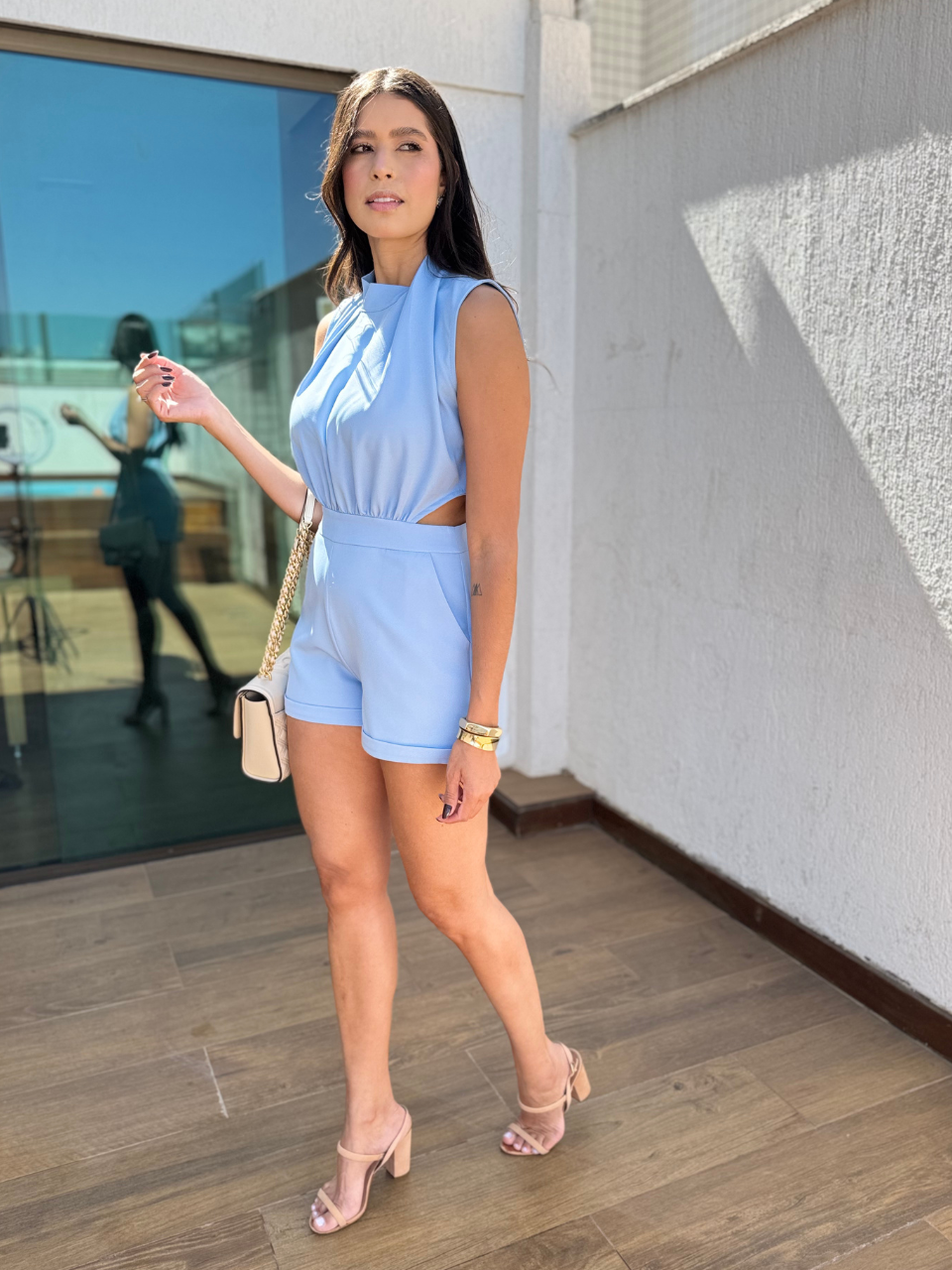 O macaquinho alfaiataria Eva é a tradução perfeita de elegância minimalista com um toque moderno. Tecido encorpado e com excelente caimento, essa peça entrega sofisticação e conforto em igual medida. Com design clean e estrutura impecável, o destaque fica por conta da gola alta com leve drapeado e detalhe alongado no decote, que valoriza o colo com discrição e charme, possui dois botões para fechamento na gola. A cintura é marcada e o short de modelagem soltinha com zíper nas costas para fechamento.