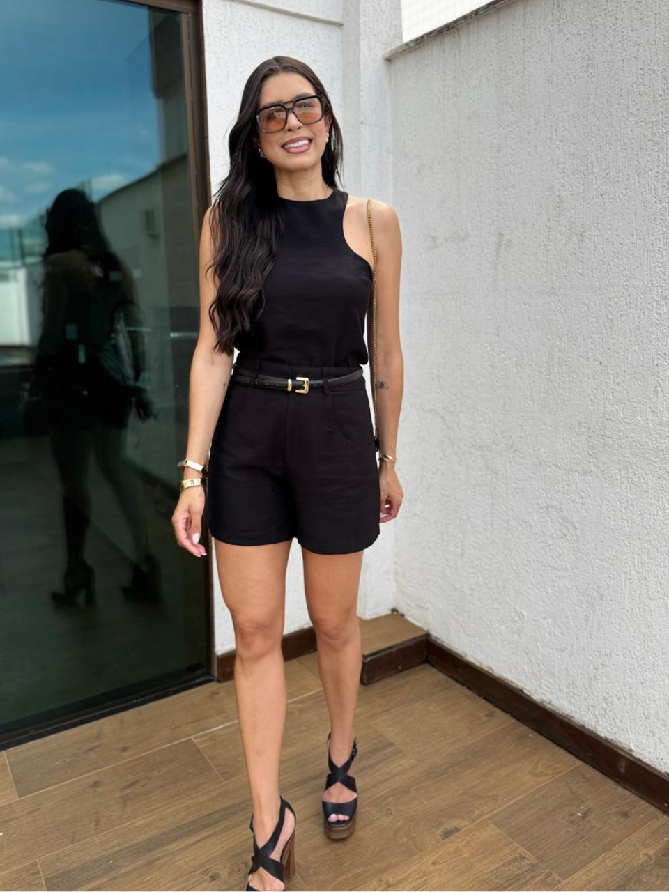 Shorts de alfaiataria com cintura alta e cós tradicional. Possui bolsos fundos frontal, botão e zíper para fechamento, passantes para cinto.